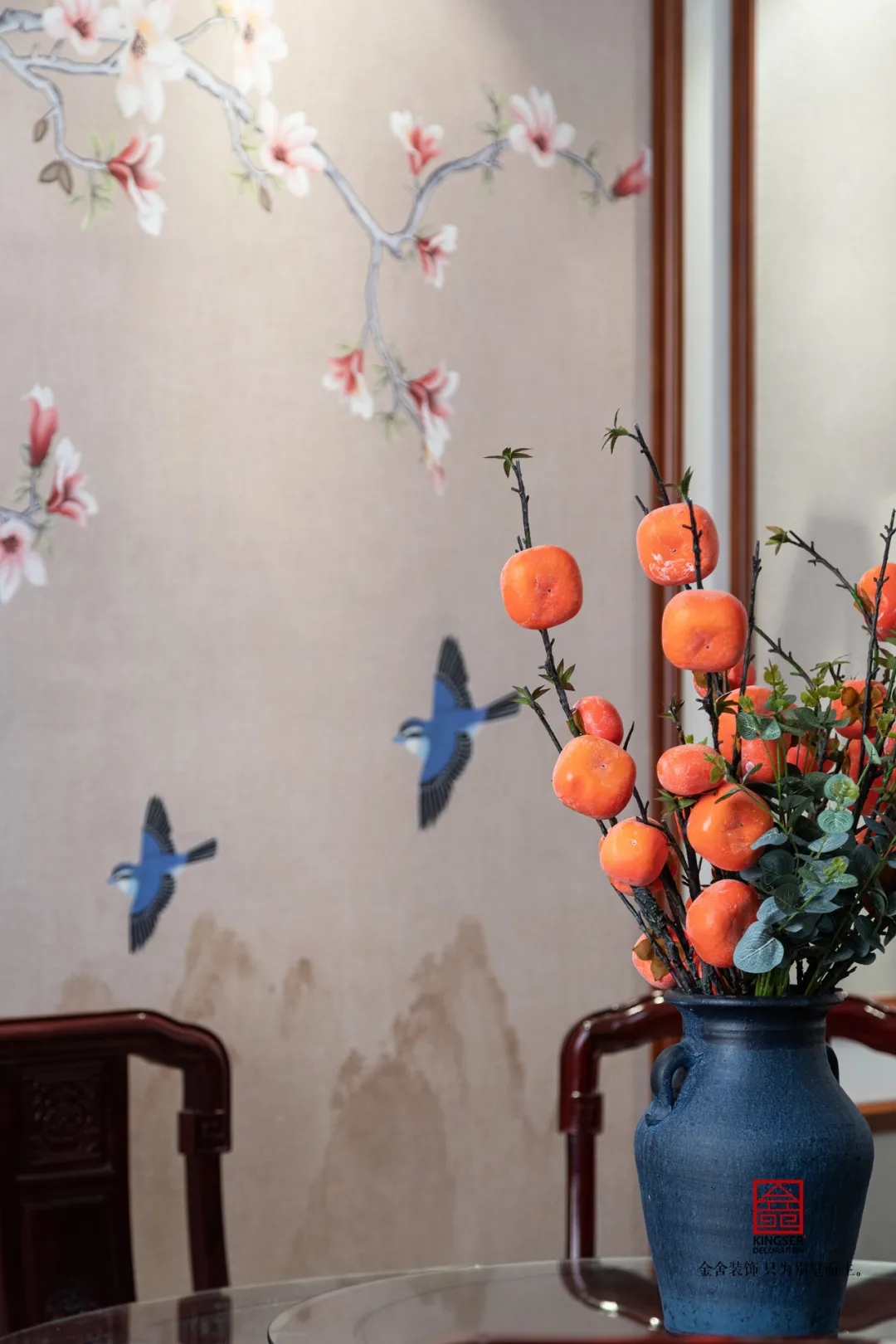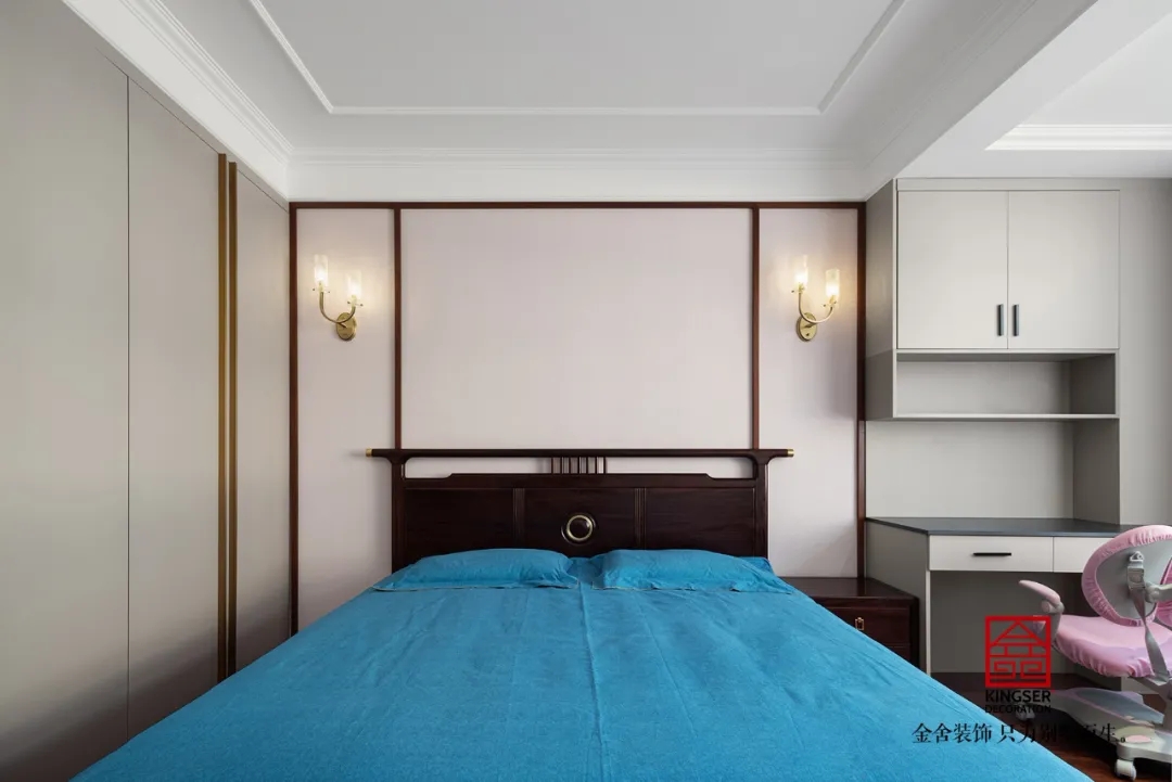 餐廳的圓形餐桌與方形吊頂相呼應(yīng),完美的嵌入了“方圓之間”的東方生活美學(xué)。既保留了原有頂面的高度又合理的劃分了空間,讓空間看起來(lái)更寬敞。餐廳背景墻的工筆花鳥(niǎo)更是提高了整個(gè)空間的靈動(dòng)感,似在平淡的生活增加一份閑趣,讓家人在一飲一品之間感受生活的幸福。