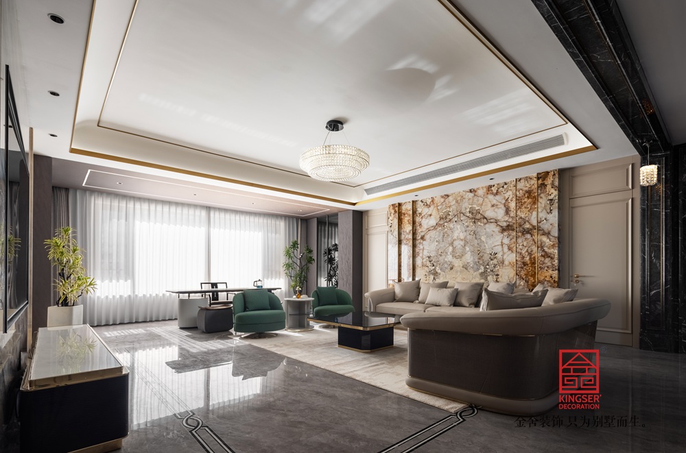 客廳是沒有陽臺的所以說采光是這個戶型的比較大的一個痛點(diǎn),結(jié)合這個原因,設(shè)計師沒有用一些傳統(tǒng)的墻板來做這樣的造型,而是采用了肌理感非常強(qiáng)的維詩康的壁布來做造型,環(huán)保性非常強(qiáng),顏色的選擇也很多,本案選擇的顏色是琥珀金色,比較貼合新中式的風(fēng)格