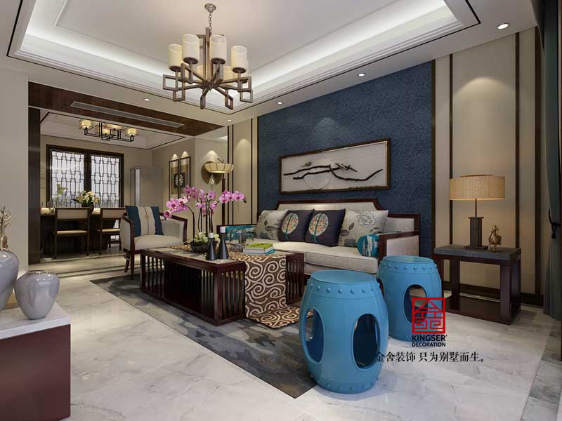 在室內(nèi)裝飾設(shè)計(jì)搭配上,以沉穩(wěn)的深色調(diào)為主搭配藍(lán)色紅色等亮色形成對(duì)比,表達(dá)對(duì)清雅含蓄、端莊豐華的東方式精神境界的追求。