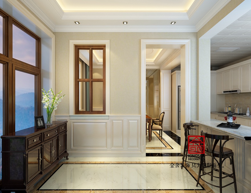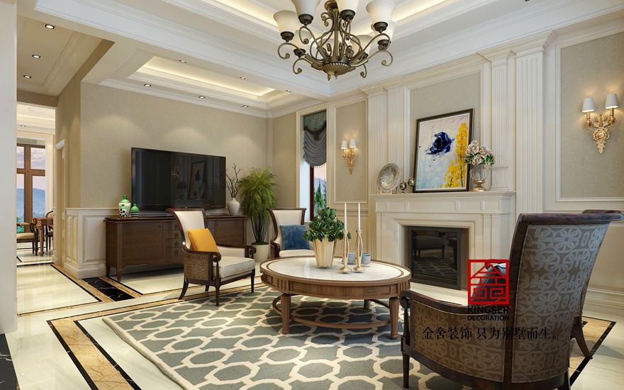 本案為石家莊金舍裝飾-大者300平米美式風(fēng)格裝修效果圖。采用了簡單明了的淺色調(diào)的清新美式風(fēng)格,整體的色調(diào)采用了淺米黃色的素色壁紙,加之乳白色簡潔造型,精致的銅鑄吊燈,使得整個空間錦上添花,質(zhì)樸而不奢華。搭配亮色布藝和簡潔干練的美式家具,使得整個空間簡潔大方,質(zhì)樸典雅,完美的符合了業(yè)主提出的“簡潔而不簡單”的設(shè)計理念。