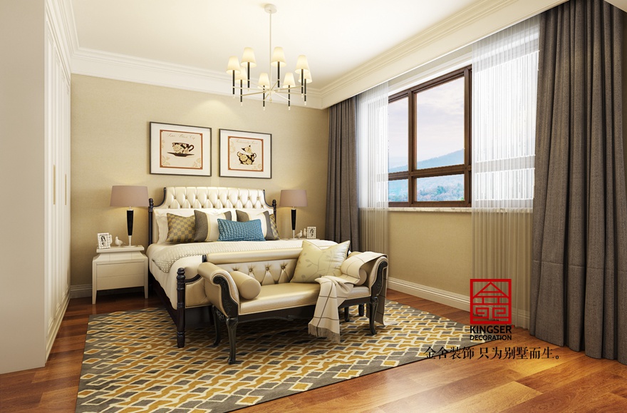 考慮到臥室的休息性,在色調(diào)上采用了淺灰色作為背景墻的主色調(diào),即溫和又不會顯得沉悶,有助于提高業(yè)主的睡眠質(zhì)量。經(jīng)典的美式“三段式”’造型,沒有過多復(fù)雜邊線,簡潔干練,搭配頗有現(xiàn)代感的金屬燈飾及飾品,使整個空間簡而不失潔時尚。整體的方案圍繞清新的美式風(fēng)格的簡單舒適,質(zhì)樸典雅來設(shè)計,完美詮釋了業(yè)主的提出的“簡潔而不簡單”的沒事風(fēng)格,也體現(xiàn)了業(yè)主對高品質(zhì)生活的要求。