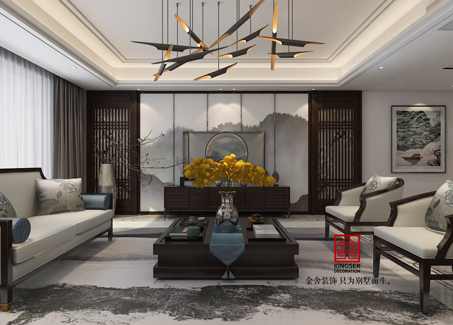 整體的色調(diào)以黑白灰為主,根據(jù)需求從新劃分功能空間,并參考了中式園林里面的造景手法,達(dá)到室內(nèi)空間的“一步一景”。入戶(hù)玄關(guān)位置把原有的墻面做了一些拆改,透過(guò)中式八角窗,映入眼簾是茶室桌面上的盆景,兩個(gè)石獅子也體現(xiàn)了充分的中式元素。錯(cuò)落的竹節(jié)燈,不僅起到了照明的作用,也有著著節(jié)節(jié)高升的寓意。家具造型簡(jiǎn)約,采用棉麻、·胡桃木、金屬等材質(zhì)打造空間內(nèi)的氣質(zhì)元素,與香道飾品完美融合,收放自如的詮釋了東方的精髓,讓人倍感上流社會(huì)的優(yōu)雅與品味。