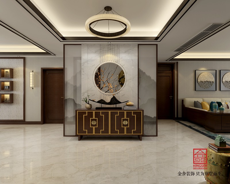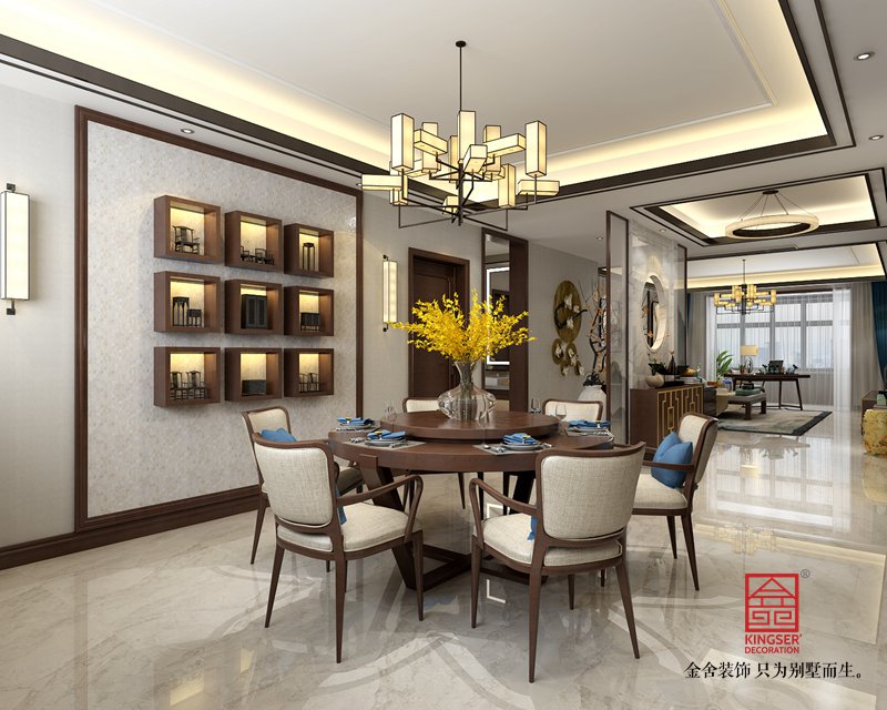 本案為石家莊金舍裝飾-御河上院176平米新中式風格裝修效果圖。位于河北石家莊正定新區(qū)的一套大平層豪宅度假房。根據項目的特點,設計師在設計風格定位時采用現代中式風格,通過合理的空間規(guī)劃,材質與色彩的精心拿捏,營造出一處富有尊貴感和人文特色的中國式家居空間。