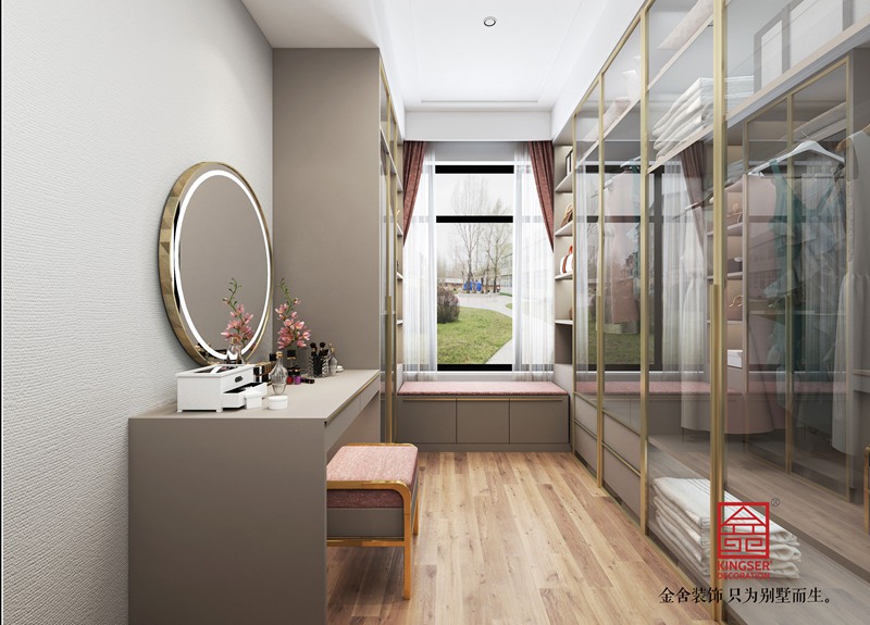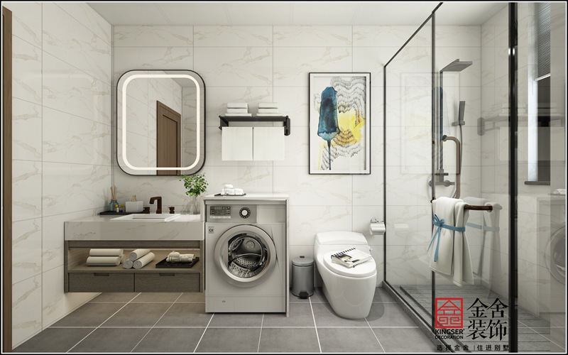 衣帽柜玻璃與木飾面結(jié)合,剛?cè)岵?jì),金屬的光澤穿插在空間中,當(dāng)光線透過時,斑駁的剪影勾勒出一副動人的畫面。衛(wèi)生間白色的瓷磚干凈整潔與浴室柜的木飾面溫暖明亮。