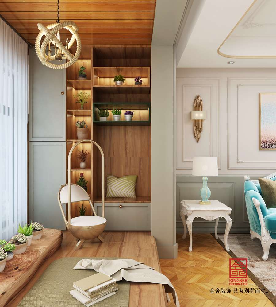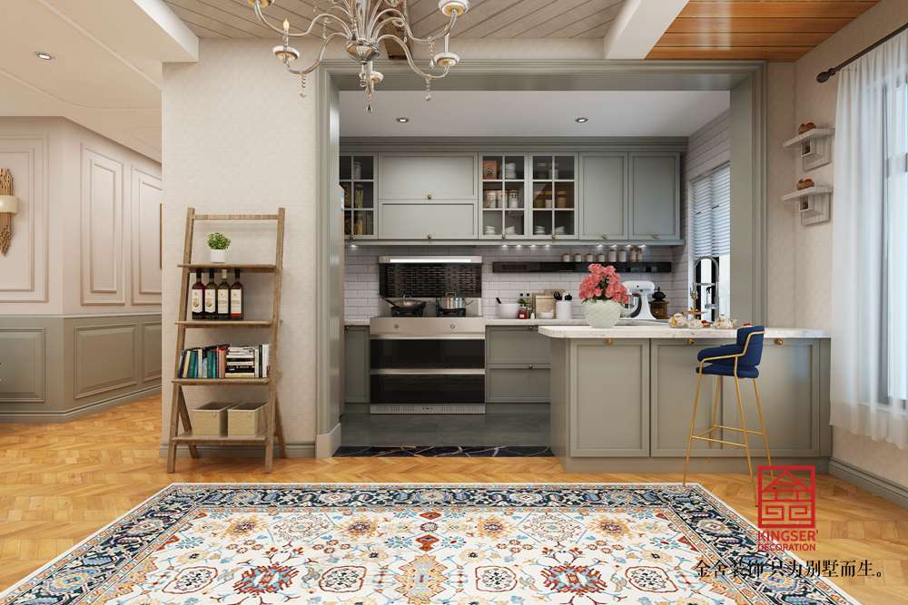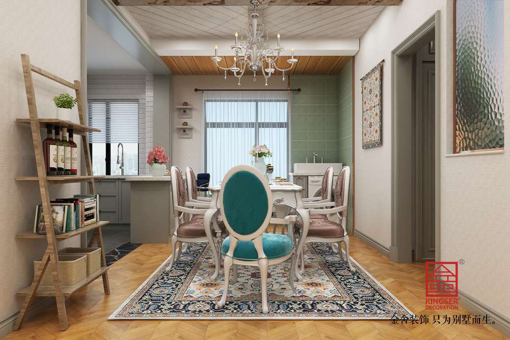 設(shè)計說明:此案例為石家莊金舍裝飾-東南智匯城126平米法式輕奢風格裝修效果圖。藍色系具有立體感的沙發(fā)顏色,使墻面很顯層次感;多彩的地毯、靈動設(shè)計的臺燈、不拘一格的掛畫,營造出一幅自由、溫馨、浪漫的氛圍;而客廳旁的落地窗給足了這間空間明亮的自然采光,用餐區(qū)域餐桌上方的水晶吊燈與客廳中的精致吊燈遙相呼應,讓整個空間之中都映射出一種浪漫氛圍,法式風格如同法國這個國家一樣,浪漫迷人,仿佛普羅旺斯的陽光,灑滿你的家。藍色調(diào)營造浪漫時尚法式風情,尋求心靈的自然回歸感;將法式傳統(tǒng)的三顏色與當季流行色融合,不失法式的貴氣和浪漫