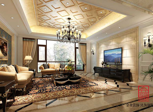 石家莊金舍裝飾-萬(wàn)科東麗湖300平米歐式風(fēng)格裝修效果圖。電視背景墻采用大理石使整個(gè)空間在視覺上更加高貴、典雅,背景墻旁搭配復(fù)古形狀的臺(tái)燈,盡顯雅致,茶幾上擺放復(fù)古的燈架和花束作為裝飾,讓空間更為清新自然,石膏吊頂,搭配精致的水晶吊燈、復(fù)古的壁畫,營(yíng)造出一種懷舊、浪漫的感覺,仔細(xì)觀察,即使是一個(gè)小地方,一件擺件的挑選,起承轉(zhuǎn)合間,空間里有了色彩注入,有了細(xì)節(jié)規(guī)劃,讓家氛圍豐富而現(xiàn)代。