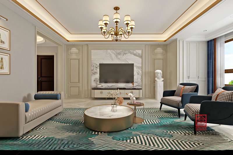 石家莊裝修公司-榮盛華府190平戶型裝修設計案例,美式輕奢風格,整體給人一種簡約大氣的氣息,沒有反復的空間布局,每處都格外的干凈利落,而且現(xiàn)代實用。無論是房頂?shù)牡鯚?,還是腳下的地板,沒有瑣碎多余的設計,表面光滑柔和,讓人感覺溫暖而舒適。