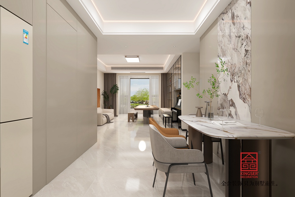 材質(zhì)上,原木的自然質(zhì)感、大理石的光潔以及金屬的精致相互融合,層次豐富。燈光設(shè)計(jì)巧妙,嵌入式燈帶與頂燈營(yíng)造出柔和均勻的光照,凸顯空間通透感。整體設(shè)計(jì)摒棄傳統(tǒng)客廳的刻板,以實(shí)用與美學(xué)兼具的布局,為居者帶來(lái)更具個(gè)性與深度的生活體驗(yàn),詮釋了去客廳化設(shè)計(jì)對(duì)生活方式的創(chuàng)新與升級(jí)。