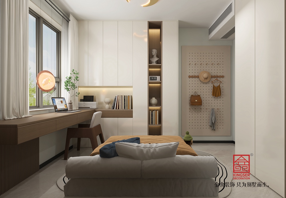 此空間采用去客廳化設(shè)計(jì),打破傳統(tǒng)客廳單一社交功能的局限,打造出集閱讀、藝術(shù)、休閑等多元體驗(yàn)于一體的復(fù)合區(qū)域。 整面玻璃書柜兼具收納與展示功能,暖光加持下,書籍仿若藝術(shù)品,營(yíng)造出靜謐的閱讀氛圍。原木長(zhǎng)桌造型獨(dú)特,成為空間核心,可滿足閱讀、手工等多樣需求,搭配簡(jiǎn)約座椅與長(zhǎng)凳,為互動(dòng)交流提供靈活場(chǎng)景。鋼琴的融入,為空間注入藝術(shù)氣息,讓居者能隨時(shí)沉浸于音樂(lè)世界。