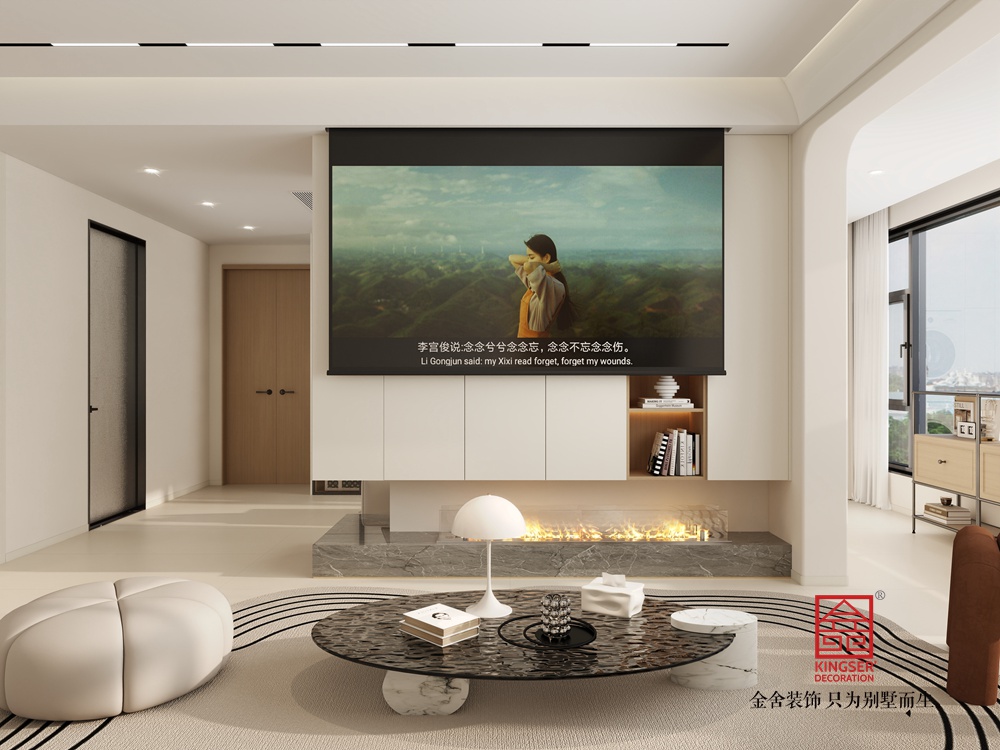 本客廳設(shè)計(jì)聚焦現(xiàn)代輕奢與實(shí)用功能的融合。以簡潔的白色為主調(diào),搭配木質(zhì)元素,營造出溫馨且雅致的氛圍。墻面設(shè)置投影幕布,結(jié)合下方的仿真火焰裝置,打造出兼具觀影與氛圍感營造的核心區(qū)域,滿足休閑娛樂需求。家具選擇上,弧形白色坐凳與造型獨(dú)特的茶幾,為空間注入柔和與精致感。整體布局通透,大窗戶引入充足自然光線,讓空間更顯開闊舒適,是一個(gè)集美觀與實(shí)用為一體的高品質(zhì)起居空間。