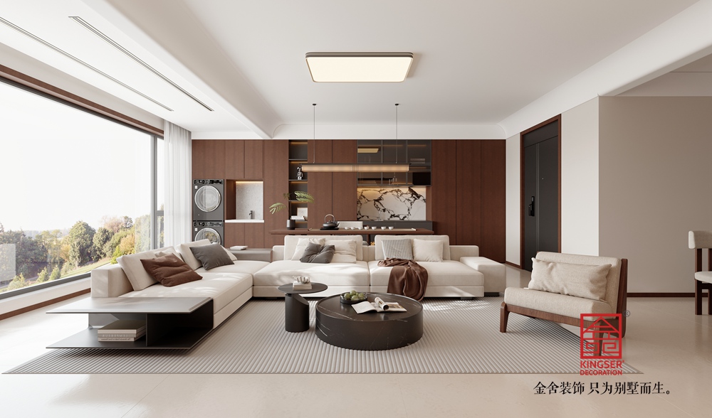頂部的方形吸頂燈,提供了明亮且柔和的照明,結(jié)合線性燈帶,營造出溫馨靜謐的氛圍。大面積的落地窗,最大限度引入自然光線,讓室外景色成為室內(nèi)景致的延伸,使空間更顯通透開闊。地面的紋理地毯,不僅劃分了功能區(qū)域,還為空間帶來細(xì)膩的觸感與視覺變化。整體設(shè)計通過對色彩、材質(zhì)的巧妙搭配以及光影的精心營造,打造出一個簡約舒適、自然雅致的現(xiàn)代客廳,盡顯對高品質(zhì)家居生活的追求。
