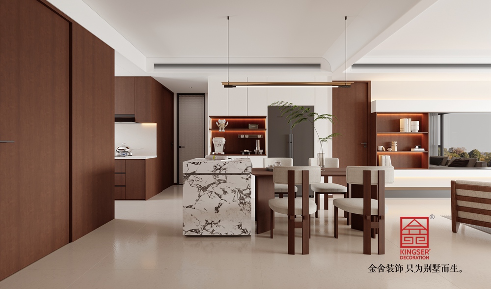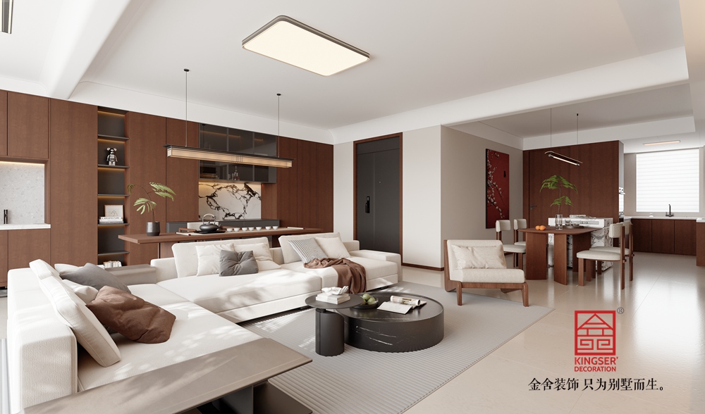 該客廳設(shè)計以現(xiàn)代簡約為核心,融合自然溫馨的質(zhì)感。空間以淺色調(diào)為基礎(chǔ),搭配深棕色木質(zhì)柜體,營造出和諧且富有層次的視覺效果。